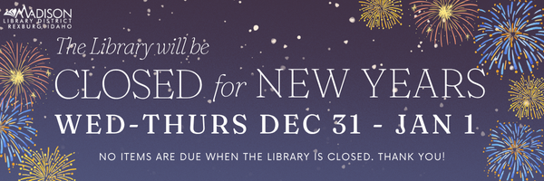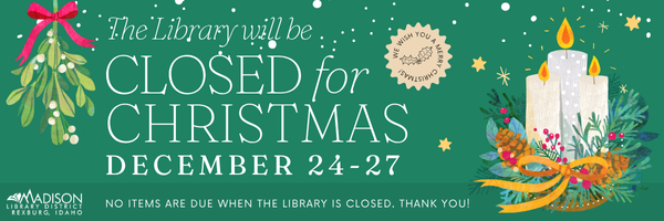 The Library will be closed December 24-27 and December 31-January 1 for Christmas and New Years. No items will be due. Thank you!