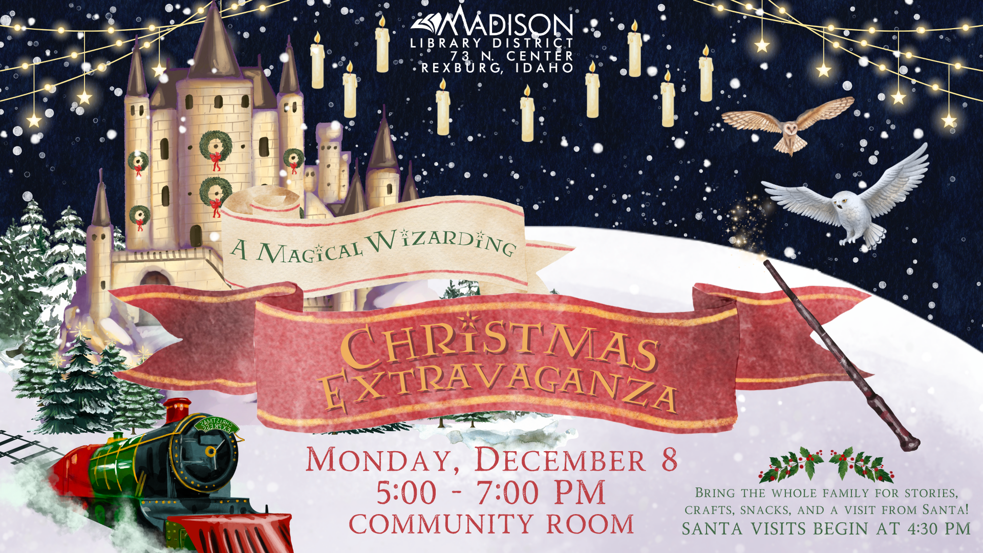Don your longest robes and dust off your enchanted hats for a magical evening of Yule merriment! Come Monday, December 8 from 5-7 PM to listen to enchanting tales, enjoy whimsical treats, and prepare for a visit from the legendary Father Christmas himself! It promises to be an evening brimming with laughter and enchantment. Father Christmas (Santa) will make his grand entrance at 4:30 PM. Be ready to welcome him and share your wishes for the coming year! Don’t forget to bring your camera for magical photo opportunities. A spellbinding time awaits the whole family! Young sorcerers under the age of 12 must be accompanied by a grown-up.