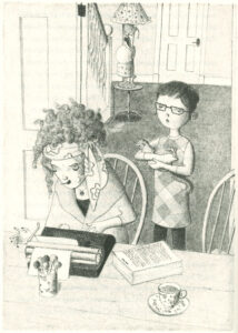 Being an LA local, what I tend to do is a little casting. I go in search of the perfect Flora or the perfect Phyllis or whoever it is. But unlike a casting director, I can select from anyone who’s ever lived. They can be fictional. Then that sort of gives me a feeling how they’re going to react physically, expressions and all that stuff. And then I do the sketches based on that. In this case, because Kate is Kate, they (the sketches) went to her. Often, the author has very little input in the illustrations. But Kate had something to say. Some characters were modified from my original sketches. Now they are what they are so that’s perfect.