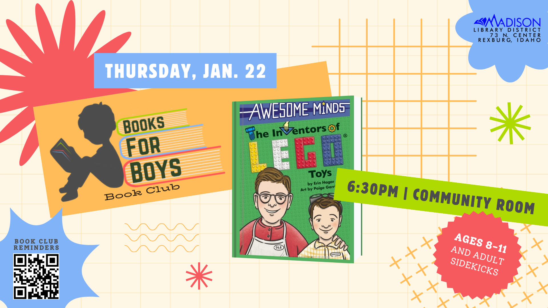 Join Books for Boys on Thursday, January 22 at 6:30 PM in the Community Room! This month we’re reading Awesome Minds: The Inventors of LEGO Toys by Erin Hagar – discover the amazing true story of how a Danish carpenter created the world’s most popular building toy!