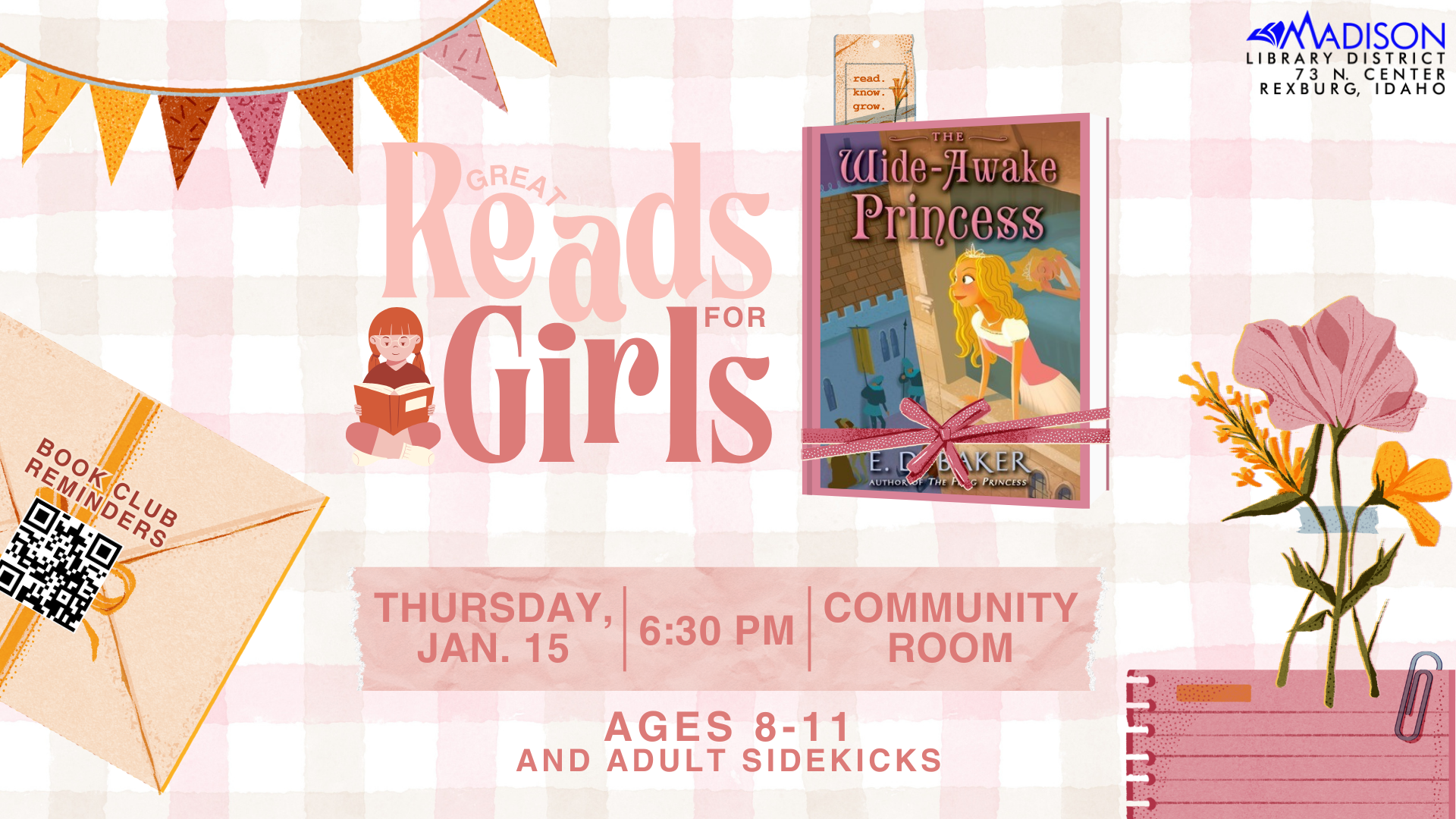 Join Great Reads for Girls on Thursday, January 15 at 6:30 PM in the Community Room for a magical evening! We’re discussing The Wide Awake Princess by E.D. Baker – a twist on Sleeping Beauty where Princess Annie is immune to magic and has to save the day when her sister’s curse goes totally wrong!