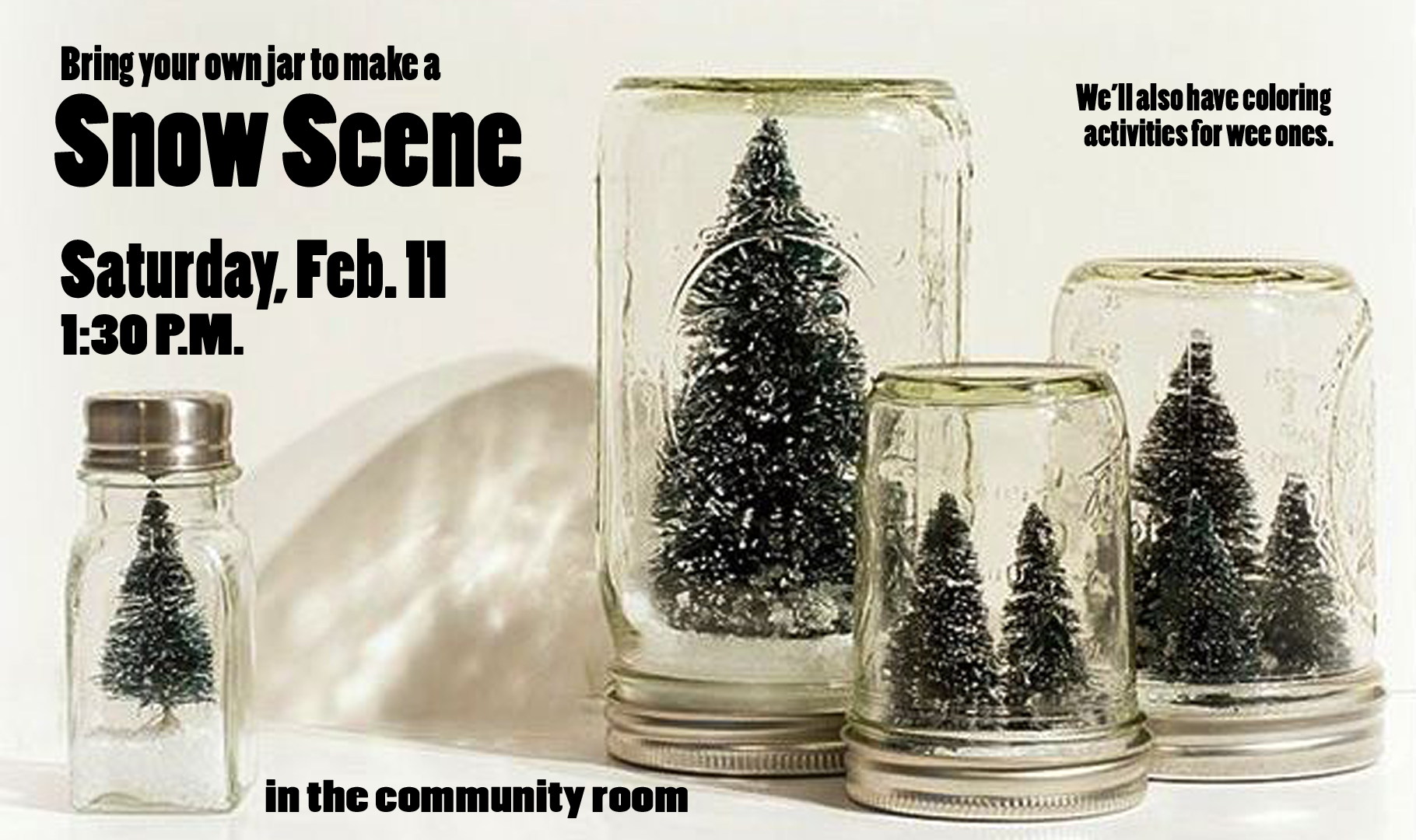 Come and make a wintry scene in a jar. You’ll need to provide the jar (jam jar, small pick jar, etc.) We’ll give you a small tree, a small bush, a bit of no-refrigeration-required snow, and the glue to hold it together. Feel free to bring other items you might want to include in your personal winter wonderland. Please, 1 jar per person.